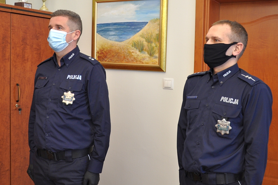Komendant Szkoły insp. Piotr Cekała w obecności swoich zastępców insp. Doroty Przypolskiej i nadkom. Aliny Majchrzak przywitał w gonie kardy dwóch kolejnych policjantów. Funkcjonariusze otrzymali także wyróżniki z logo słupskiej Szkoły Policji.