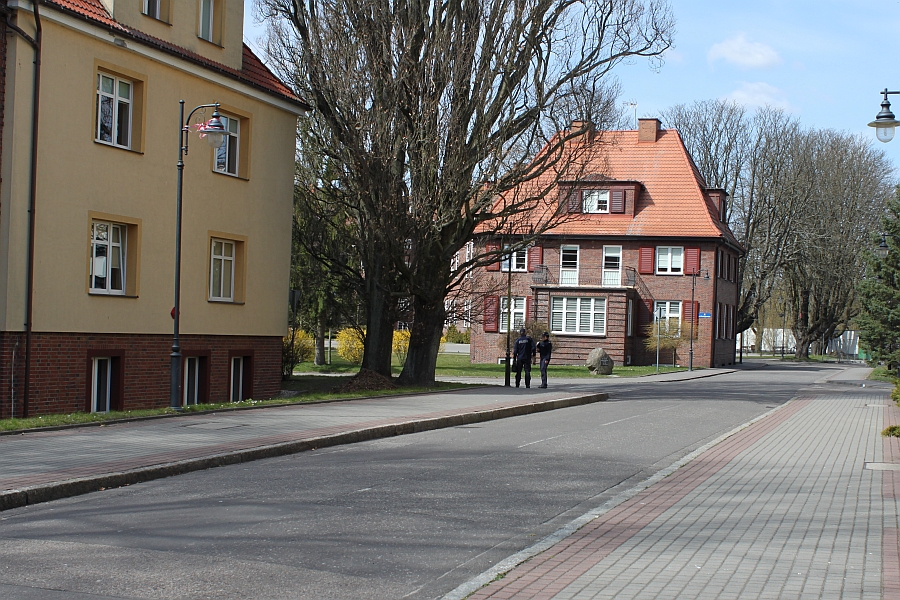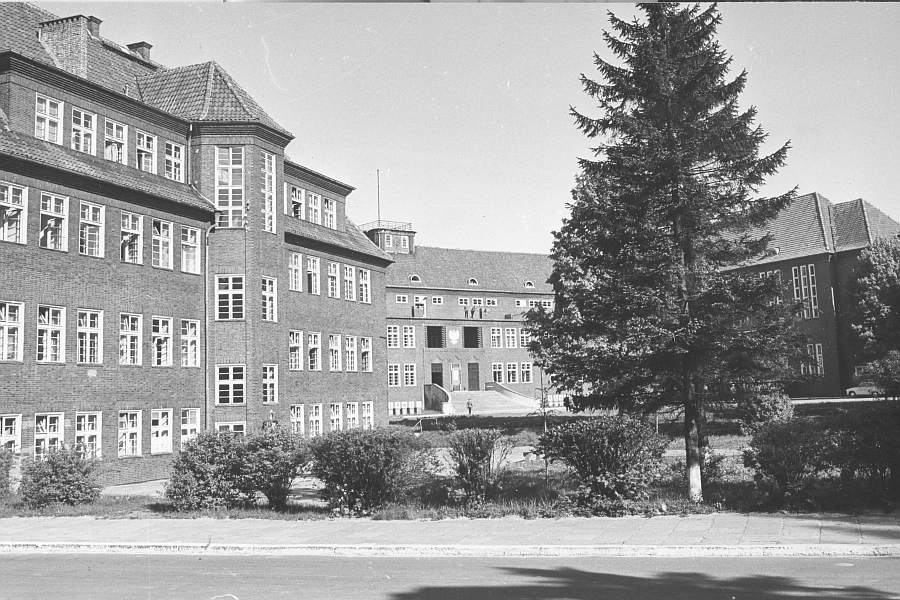 Bogaty drzewostan i żywopłoty znajdowały się przy głównej ulicy Szkoły. Po lewej stronie, ukryty za drzewami znajduje się budynek, w którym dziś mieści się między innymi Wydział Teleinformatyki. Maszerujący pododdział to reprezentacja milicjantów węgierskich, która przyjechała do Słupska na mecz z polskimi milicjantami, który rozegrano na stadionie przy ulicy Madalińskiego.