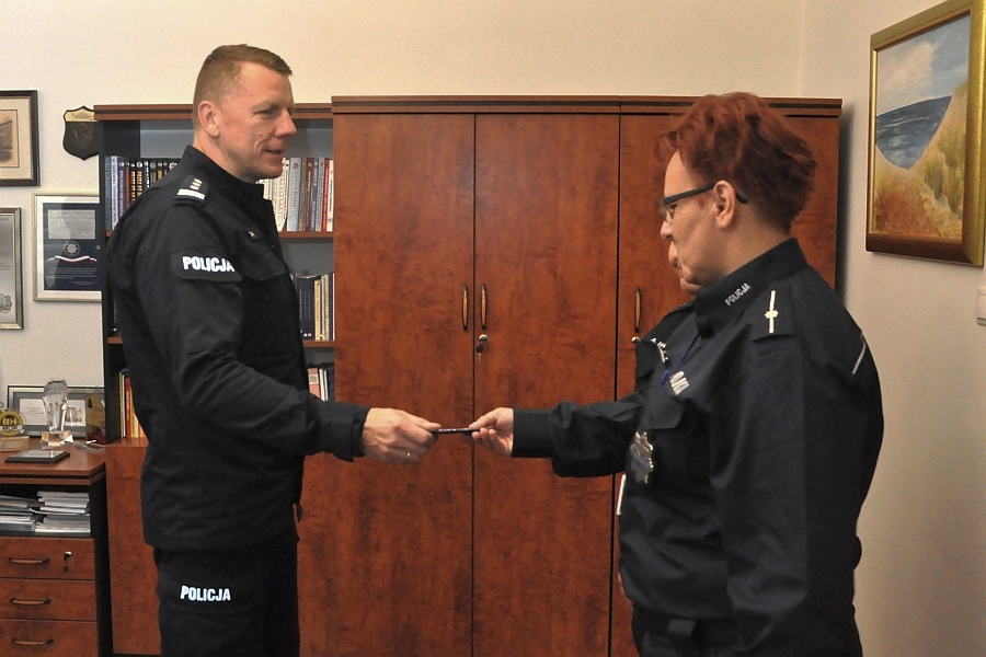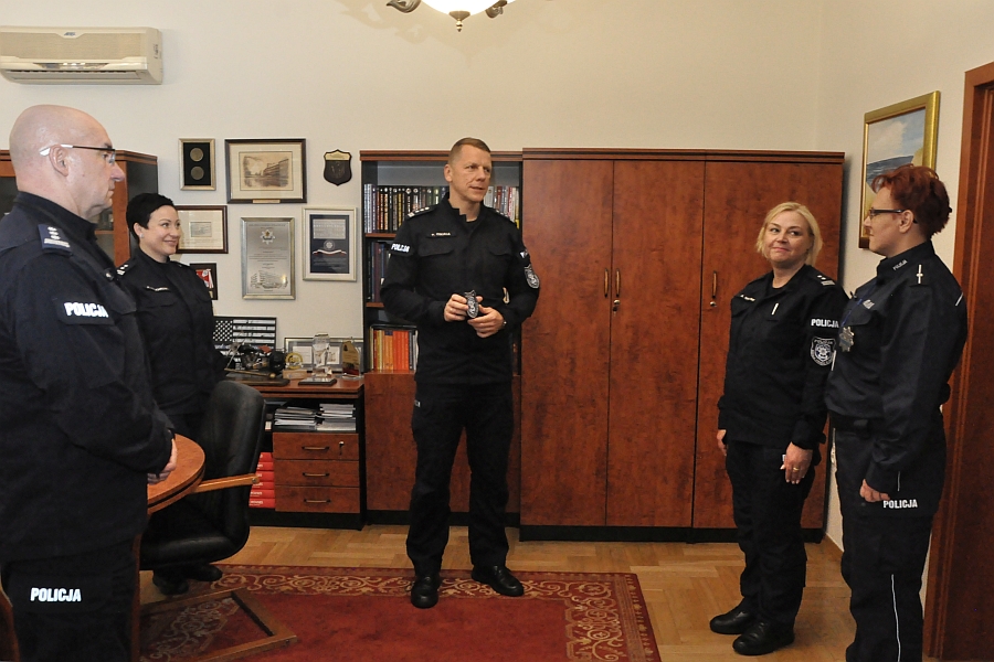 Krótkie spotkanie powitalne odbyło się w gabinecie Komendanta, który oficjalnie przywitał nową policjantkę w gronie kardy i życzył jej wielu sukcesów w służbie i w życiu prywatnym. Insp. Piotr Cekała wręczył mł.asp. Małgorzacie Wójcik plakietkę - wyróżnik Szkoły Policji, która noszona są na lewym rękawie policyjnego umundurowania. W gronie kadry przywitali ją oficjalnie również Zastępcy Komendanta podinsp. Alina Majchrzak i insp. Maciej Marciniak.