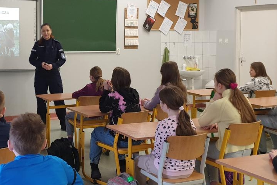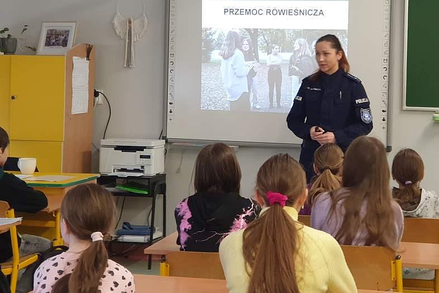 Na spotkaniu z uczniami Szkoły Podstawowej nr 5 w Słupsku mł.asp. Monika Sadurska z Zakładu Ogólnozawodowego Szkoły Policji poruszała tematy związane z przemocą rówieśniczą. Zagadnienia z tym związane pojawiają się ostatnio w mediach społecznościowych za sprawą krótkich filmików ukazujących negatywne,