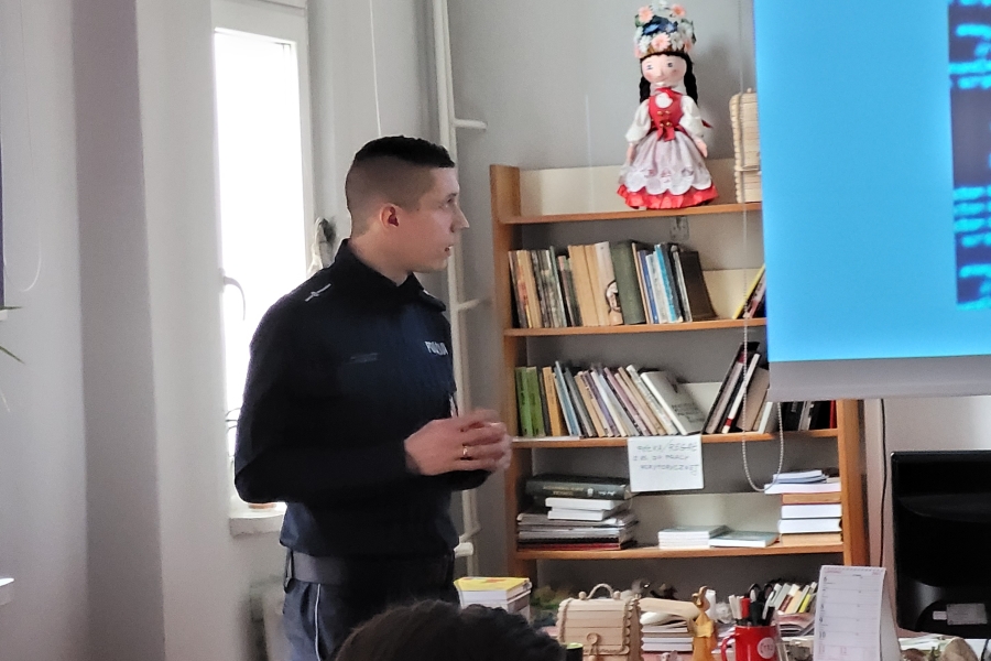 Prowadzący zajęcia mł.asp. Arkadiusz Matuszyn z Zakładu Służby Kryminalnej mówił o metodach jakimi posługują się internetowi przestępcy a także o sposobach zabezpieczenia się przed tego typu działaniami.
