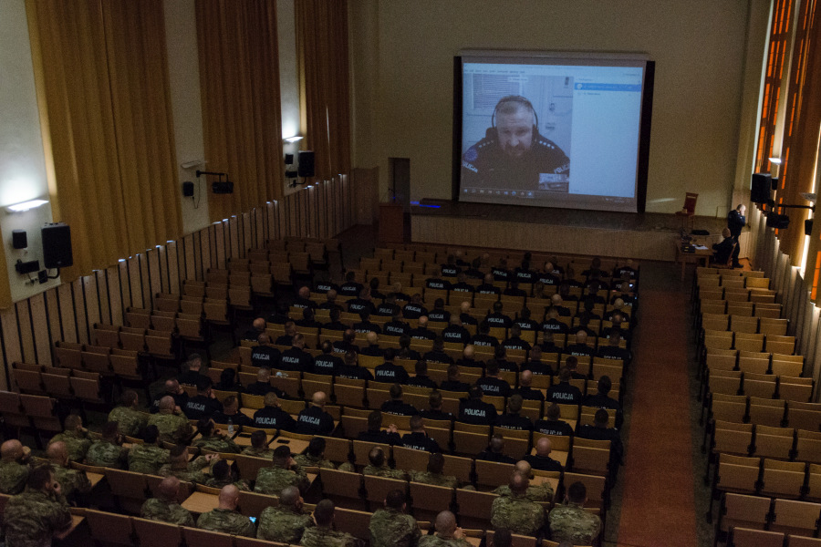 Wprowadzeniem do realiów pełnienia służby w Kosowskiej Mitrovicy było połączenie video z dowódcą obecnie stacjonującej na Bałkanach 35. zmiany Jednostki Specjalnej Polskiej Policji. Nadkom. Robert Stosio przedstawił zgromadzonym w auli policjantom realizowane zadania i specyfikę podejmowanych teraz interwencji.