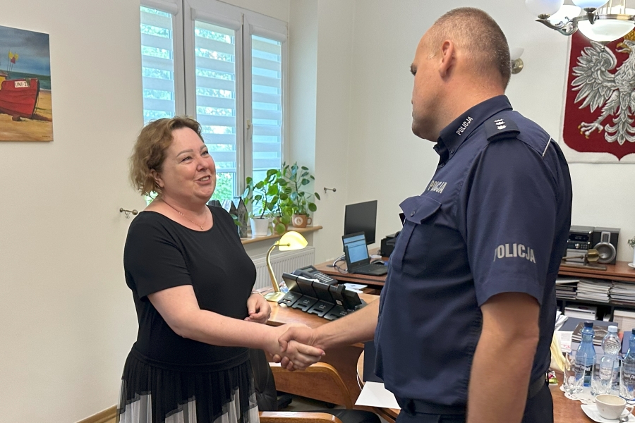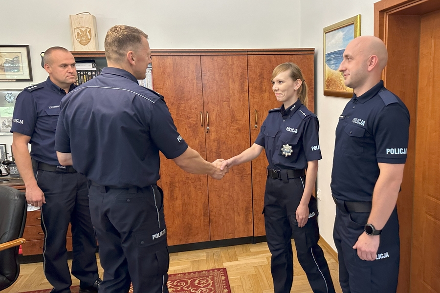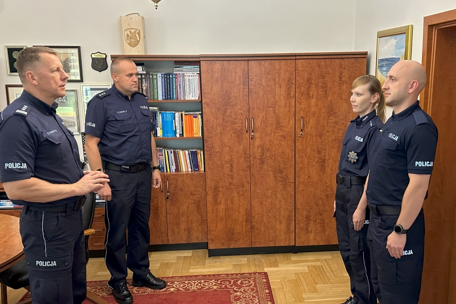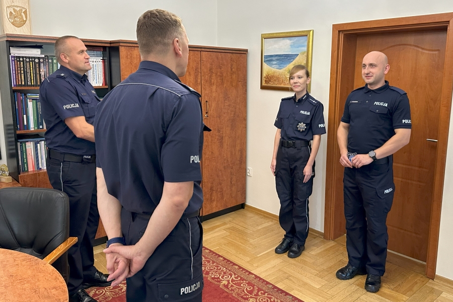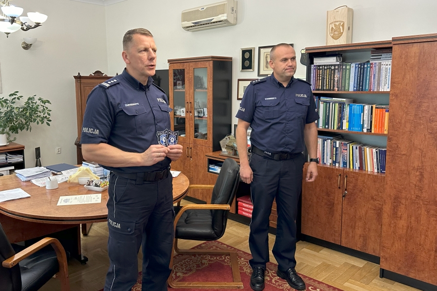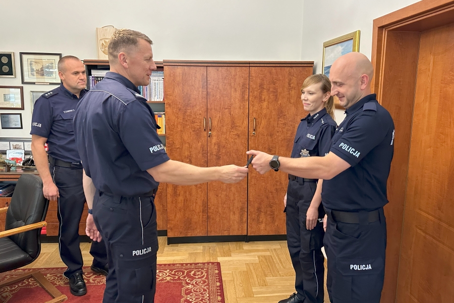 Krótkie spotkanie odbyło się w gabinecie Komendanta, który oficjalnie przywitał dwoje policjantów w gronie kadry i życzył im wielu sukcesów w służbie i w życiu prywatnym. Każdemu z nich insp. Piotr Cekała wręczył plakietki - wyróżniki Szkoły Policji, które noszone są na lewym rękawie policyjnego umundurowania. Nowi członkowie naszej kadry to: