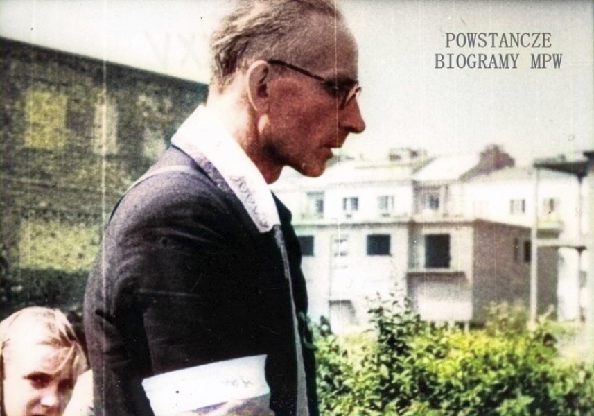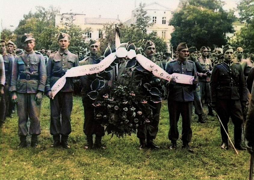 Na kolejnej fotografii przedstawiona jest delegacja Centrum Wyszkolenia Milicji Obywatelskiej, składająca wielki wieniec z napisem „Bohaterom Powstania Warszawskiego - C.W.M.O. Słupsk” w czasie odsłonięcia pierwszego w Polsce powstańczego pomnika - 15 września 1945 roku.