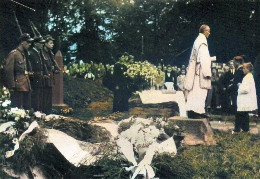 Na zdjęciach poniżej, oprócz zdjęcia ks. Jana Zieji, są też młodzi milicjanci uczestniczący w polowej mszy świętej odprawionej podczas powtórnego pochówku 22 robotników przymusowych, głównie narodowości polskiej, rozstrzelanych przez oddział SS 7. marca 1945 roku - w przeddzień przejścia Słupska z rąk niemieckich w polskie.