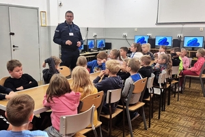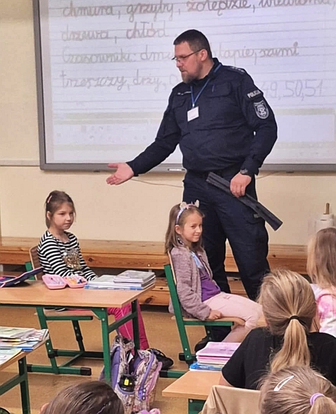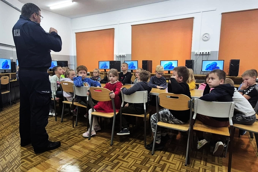 Policjant tłumaczył, jak ważne jest zachowanie ostrożności, unikanie kontaktu i natychmiastowe poinformowanie o zdarzeniu zaufanej osoby dorosłej.