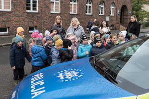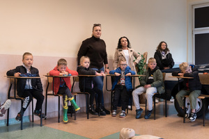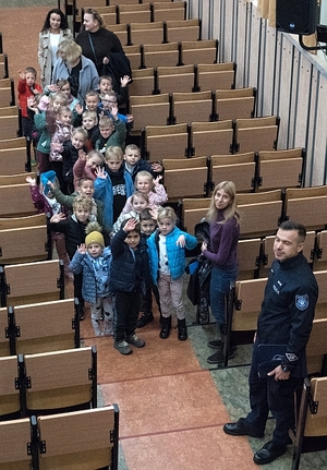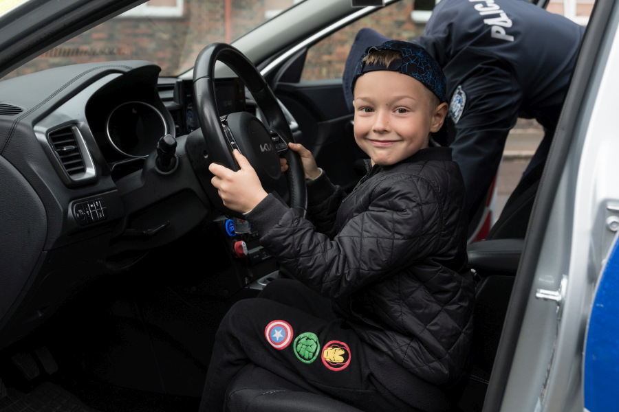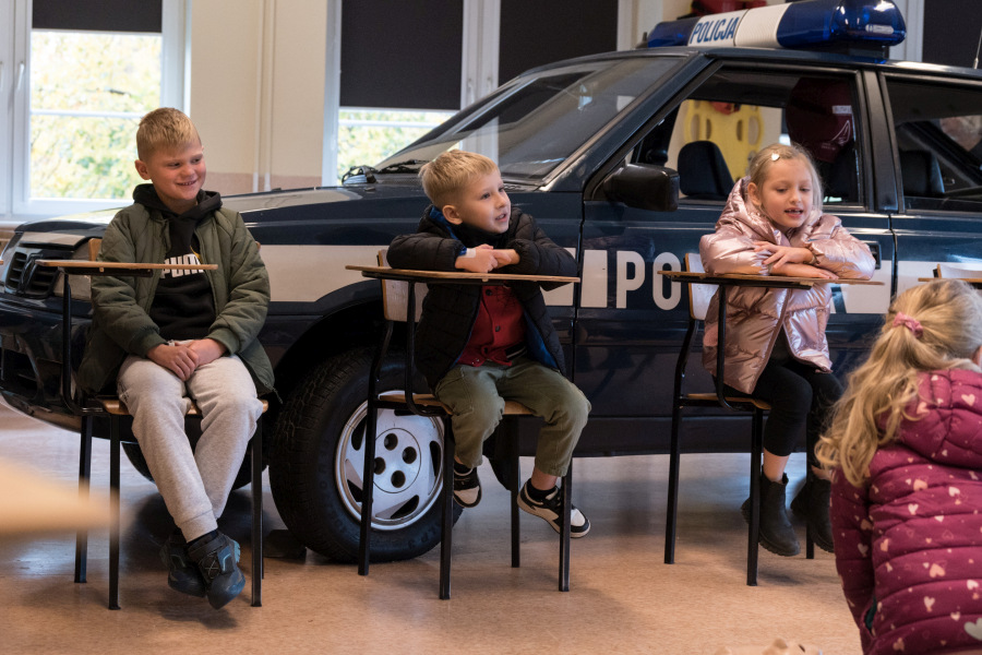 Nie zabrakło również momentów pełnych emocji - największą atrakcją była możliwość wejścia do policyjnego radiowozu i uruchomienia sygnałów świetlnych oraz dźwiękowych. W szkolnej auli dzieci obejrzały też krótki film przedstawiający przebieg szkolenia zawodowego podstawowego nowo przyjętych do służby policjantów.