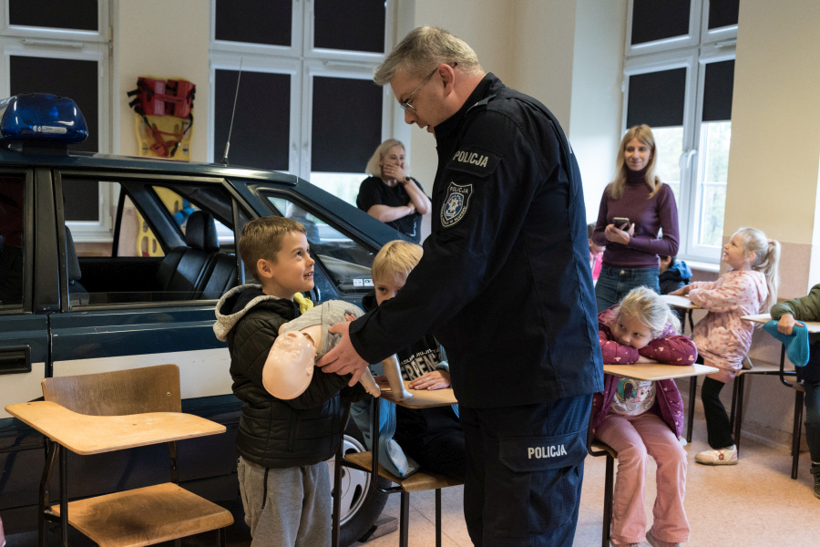 Z dużym zainteresowaniem najmłodsi uczestniczyli w zajęciach z udzielania pierwszej pomocy. Rozmawiano nie tylko o tym, jak prawidłowo wezwać pomoc, dzwoniąc na numery alarmowe, ale również o tym, jak zachować się, gdy ktoś straci przytomność lub przestanie oddychać.