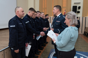 Po wręczeniu świadectw insp. Piotr Cekała - w asyście Dyrektor Regionalnego Centrum Krwiodawstwa i Krwiolecznictwa Kingi Sass oraz Prezes Klubu Honorowych Dawców Krwi PCK Anny Gołębiowskiej - wręczył podziękowania najbardziej aktywnym krwiodawcom. Pani Dyrektor i Pani Prezes wręczyły słuchaczom także drobne upominki. Najbardziej aktywni krwiodawcy to:
