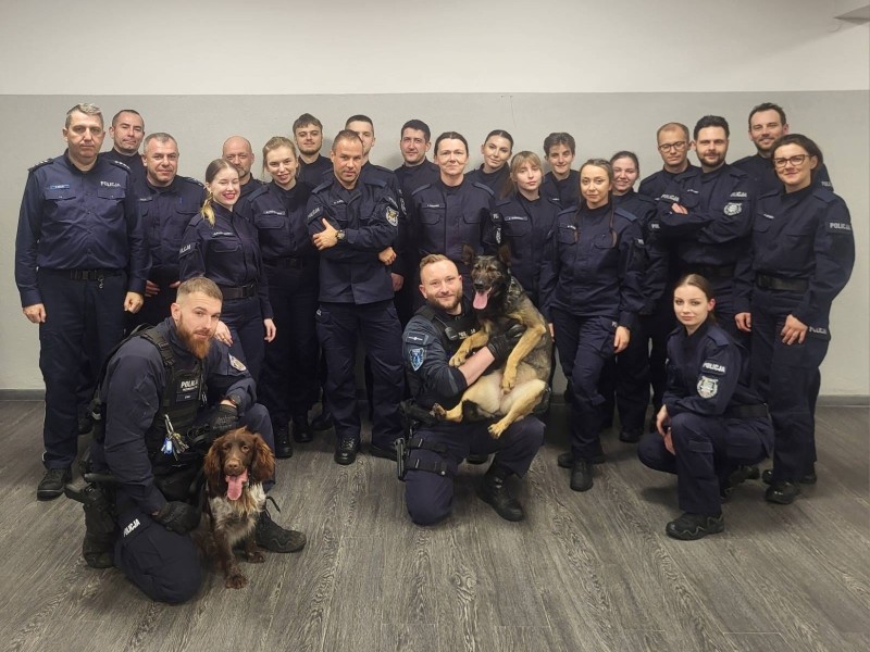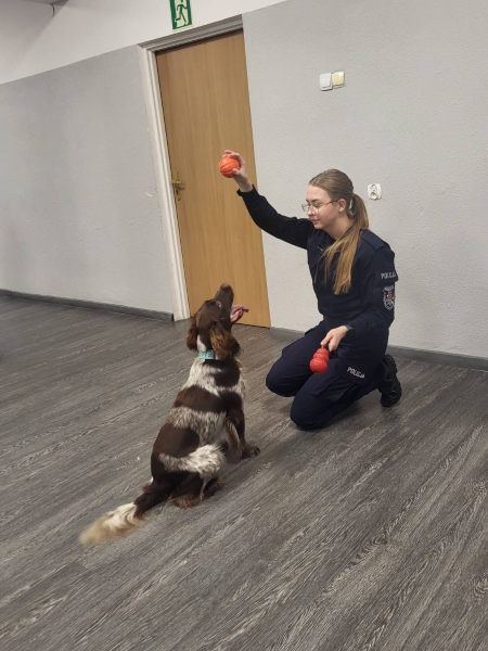 Młodzi policjanci spotkali się z dwoma psami. Pierwszy z nich to owczarek niemiecki Salma, piec patrolowo-tropiący, który uczestniczy w zabezpieczaniu meczów piłkarskich, imprez masowych i poszukiwaniu sprawców przestępstw. Drugi natomiast to polski spaniel myśliwski Ayron, który specjalizuje się w wyszukiwaniu zapachów narkotyków.