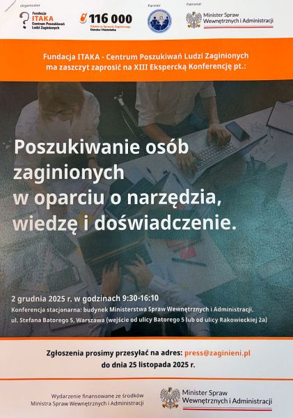 Wykładowcy Zakładu Służby Kryminalnej Szkoły Policji w Słupsku wzięli udział w XIII Eksperckiej Konferencji Fundacji ITAKA, zorganizowanej pod patronatem Ministra Spraw Wewnętrznych i Administracji. Spotkanie, które odbyło się w miniony wtorek w Warszawie, było poświęcone współczesnym metodom poszukiwania osób zaginionych oraz współpracy między służbami, organizacjami ratowniczymi i instytucjami wspierającymi te działania.