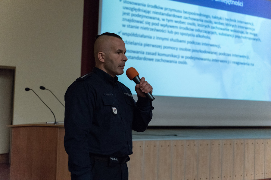 Praktyczny wymiar codziennej służby został ukazany w wystąpieniu nadkomisarza Michała Kurdziela (Komenda Wojewódzka Policji w Szczecinie), który zaprezentował doświadczenia garnizonu zachodniopomorskiego z lat 2021-2025. Omówił on lokalne doskonalenie zawodowe policjantów prewencji w zakresie reagowania na nietypowe, niestandardowe zachowania osób, wobec których podejmowane są interwencje. Wskazał, że prawidłowa reakcja policjanta wymaga nie tylko znajomości przepisów, lecz przede wszystkim umiejętności oceny zachowania człowieka, którego stan emocjonalny bywa nieprzewidywalny, niejasny lub skrajnie obciążony.