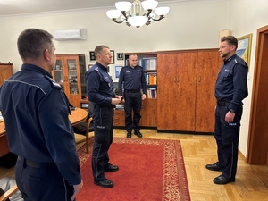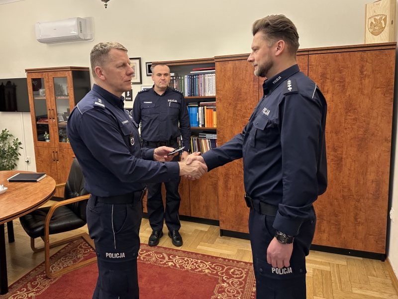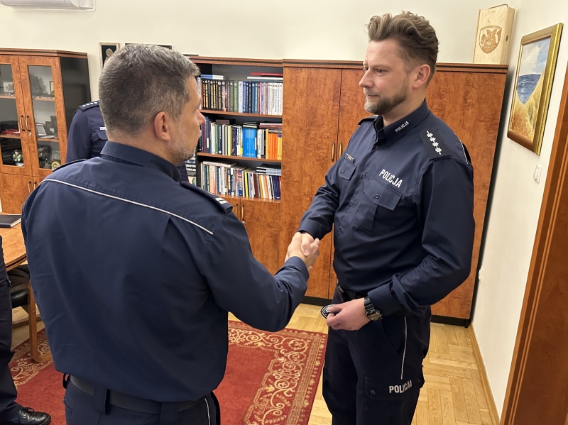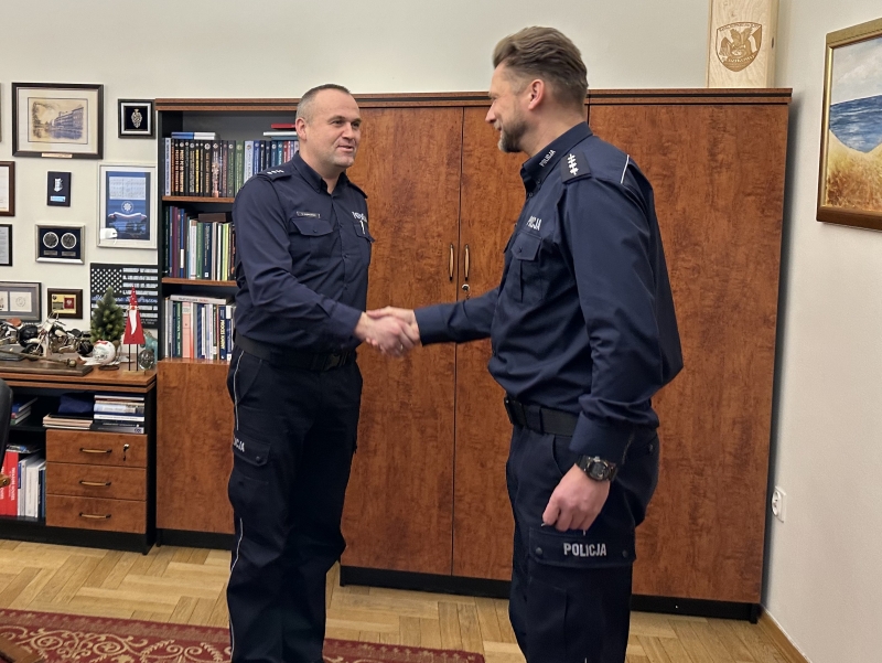 Krótkie spotkanie odbyło się w gabinecie Komendanta, który oficjalnie przywitał nowego policjanta w gronie kadry i życzył mu wielu sukcesów w służbie i w życiu prywatnym. Komendant Szkoły insp. Piotr Cekała wręczył plakietkę - wyróżnik Szkoły Policji, która noszona jest na lewym rękawie policyjnego umundurowania oraz „garnizonówkę” noszoną pod klapą prawej kieszeni. Nowy członek naszej kadry to: