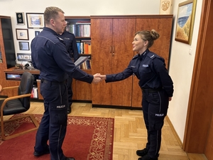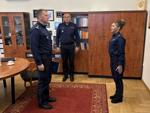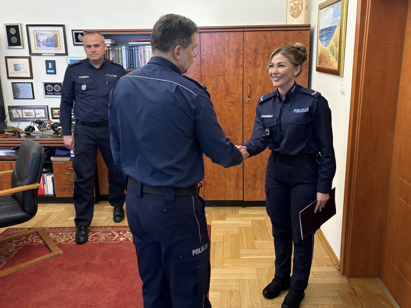 Podczas krótkiej uroczystości Komendant Szkoły insp. Piotr Cekała wręczył policjantce akt mianowania na pierwszy stopień w korpusie podoficerskim czyli na stopień sierżanta. W trakcie wręczenia obecni byli także Zastępcy Komendanta: nadkom. Szymon Dąbrowski i mł. insp. Daniel Krenc.