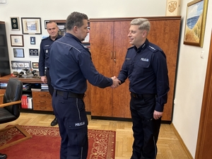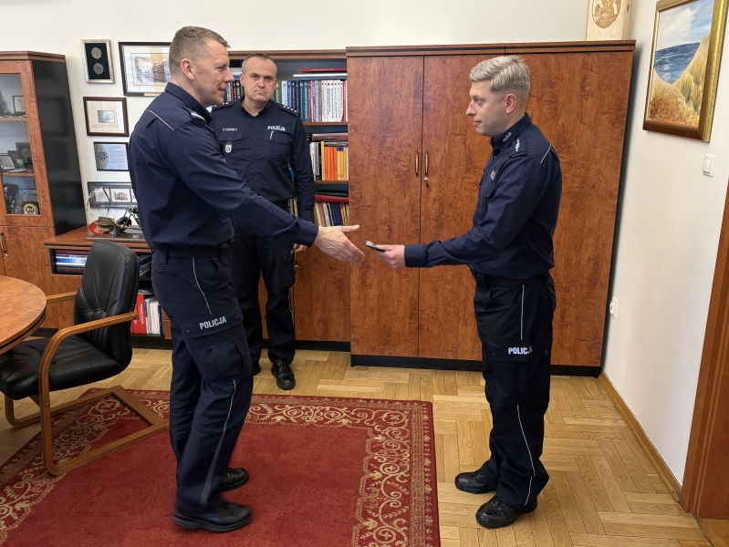 Plakietkę - wyróżnik jednostki, noszony na rękawie umundurowania, otrzymał dziś rano policjant, która dołączył do kadry słupskiej Szkoły Policji. Wyróżnik nowemu funkcjonariuszowi wręczył Komendant Szkoły insp. Piotr Cekała w obecności swoich zastępców - mł. insp. Daniela Krenca oraz nadkom. Szymona Dąbrowskiego.