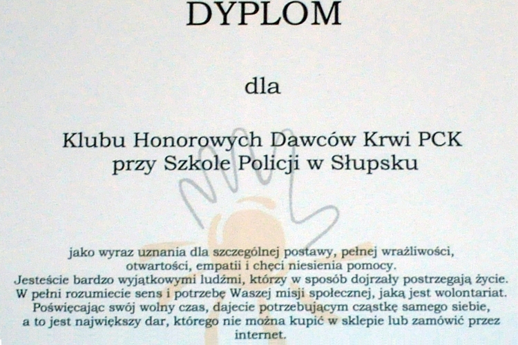 Wolontariusze Szkoły Policji w Słupsku zostali docenieni między innymi za systematyczne akcje krwiodawstwa organizowane przez Szkolny Klub HDK PCK, a także za działalność policyjnych ratowników, którzy propagują znajomość udzielania pierwszej pomocy wśród dzieci i młodzieży - także latem wśród turystów na usteckiej plaży.