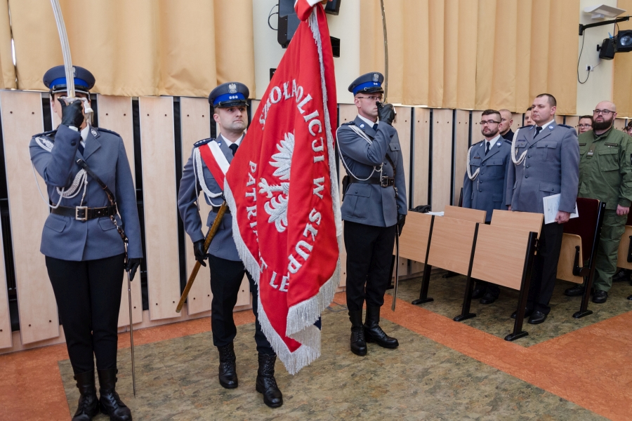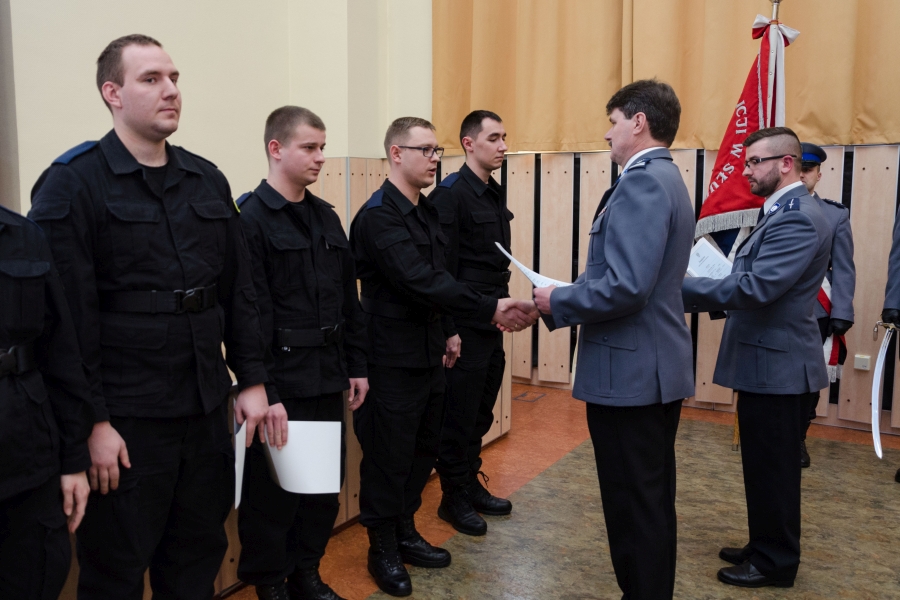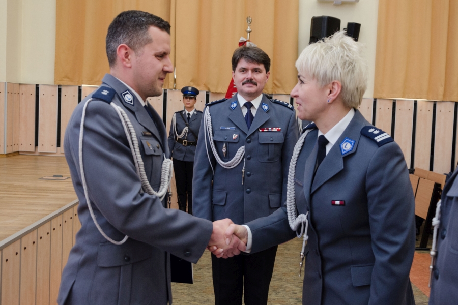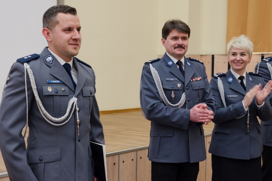 Na zakończenie części oficjalnej uroczystości komendant Szkoły insp. Jacek Gil wręczył, podpisaną przez Prezydenta RP Andrzeja Dudę, decyzję o awansie na pierwszy stopień oficerski - podkomisarza Adrianowi Goszczyckiemu.