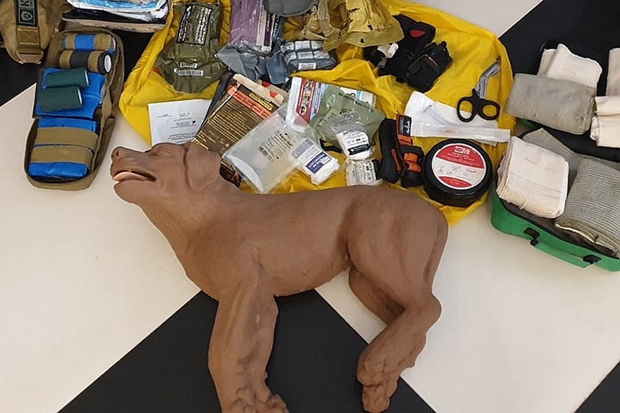 U psa z masywnym krwotokiem z kończyn można także zastosować opatrunki hemostatyczne oraz specjalne opaski uciskowe. Wszystkie działania praktyczne wykonywane były na owczarku australijskim, który jest specjalnie przeszkolony do tego typu działań i chętnie współpracował z uczestnikami warsztatów. Każda osoba udzielia pomocy rannemu zwierzęciu przy wykorzystaniu sprzętu ratowniczego będącego na wyposażeniu Policji.