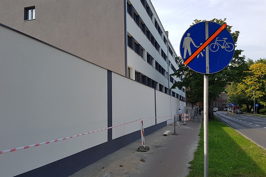 W związku z remontem ogrodzenia okalającego od północy Szkołę Policji zwężeniu uległ ciąg pieszo-rowerowy na odcinku prowadzonych robót. Wzdłuż dodatkowego ogrodzenia nie obowiązuje podział na pas dla pieszych i rowerzystów.