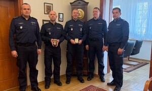 Jubileuszowy medal otrzymali w gabinecie Komendanta Szkoły członkowie kadry Szkoły Policji w Słupsku. Gratulacje policjantom złożył Komendant Szkoły insp. Piotr Cekała w obecności swoich Zastępców - mł. insp. Daniela Krenca i nadkom. Szymona Dąbrowskiego.